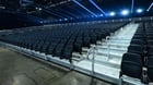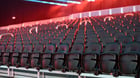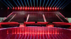 InProduction tiered amphitheater seating with red premium chairs oriented toward the stage, engineered for durability, comfort, and clear visibility.