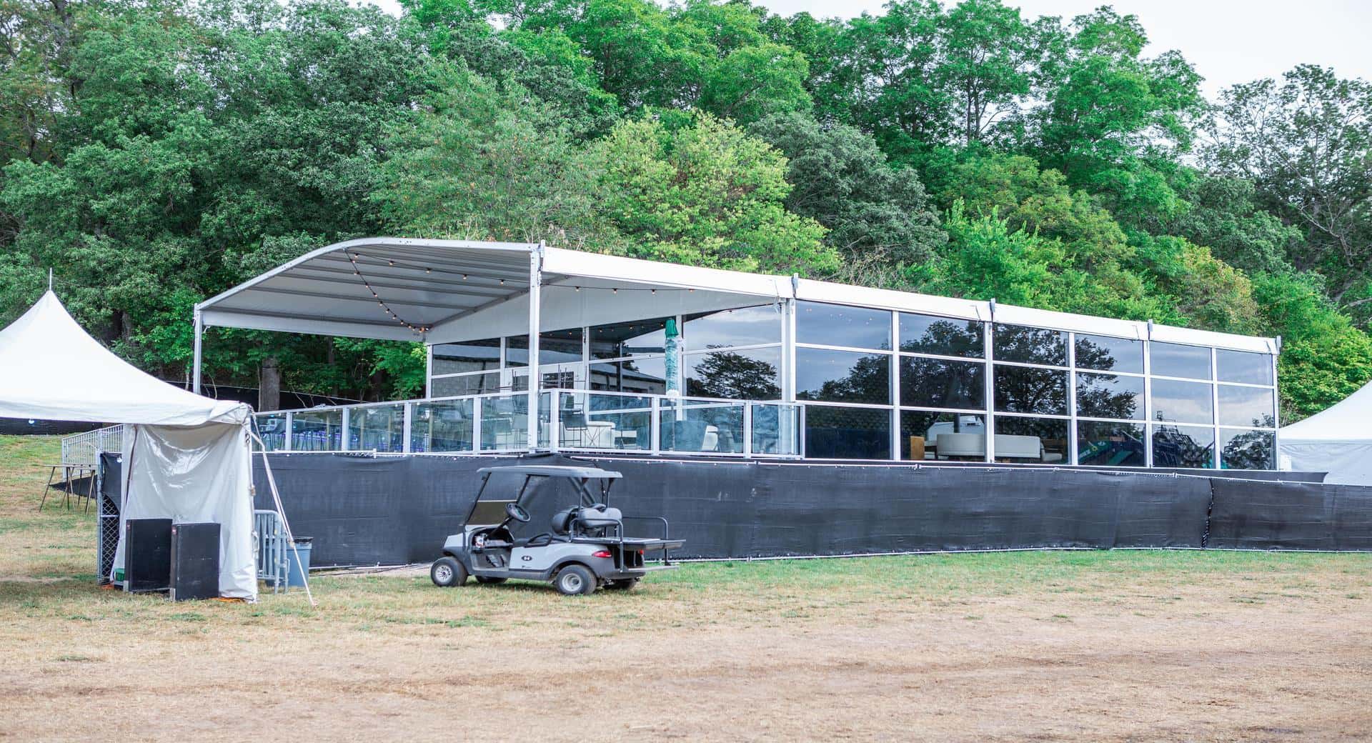InProduction hospitality structure with adjacent grandstand seating installed for the U.S. Open Championship, supporting large-scale tournament infrastructure.