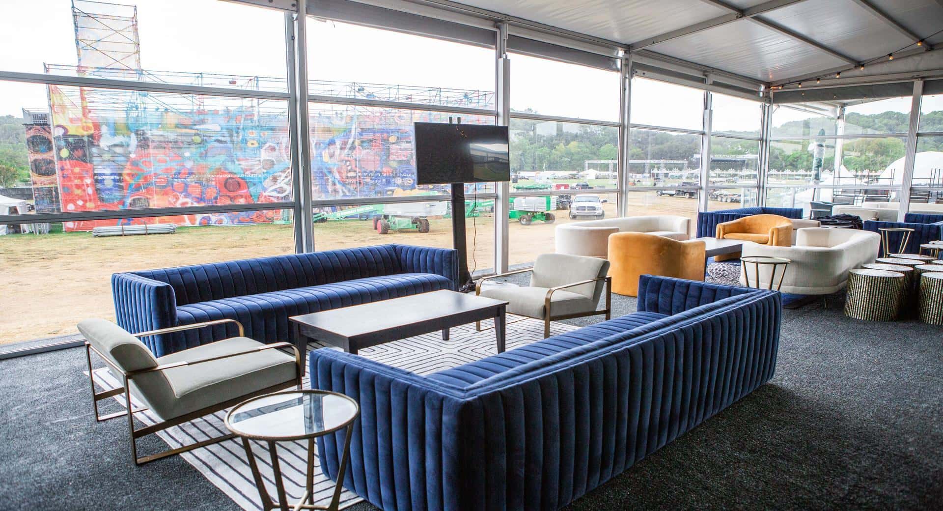 InProduction single-level hospitality structure with shaded viewing areas and integrated food-and-beverage concessions installed for Austin City Limits Music Festival to provide upgraded comfort and elevated sightlines.