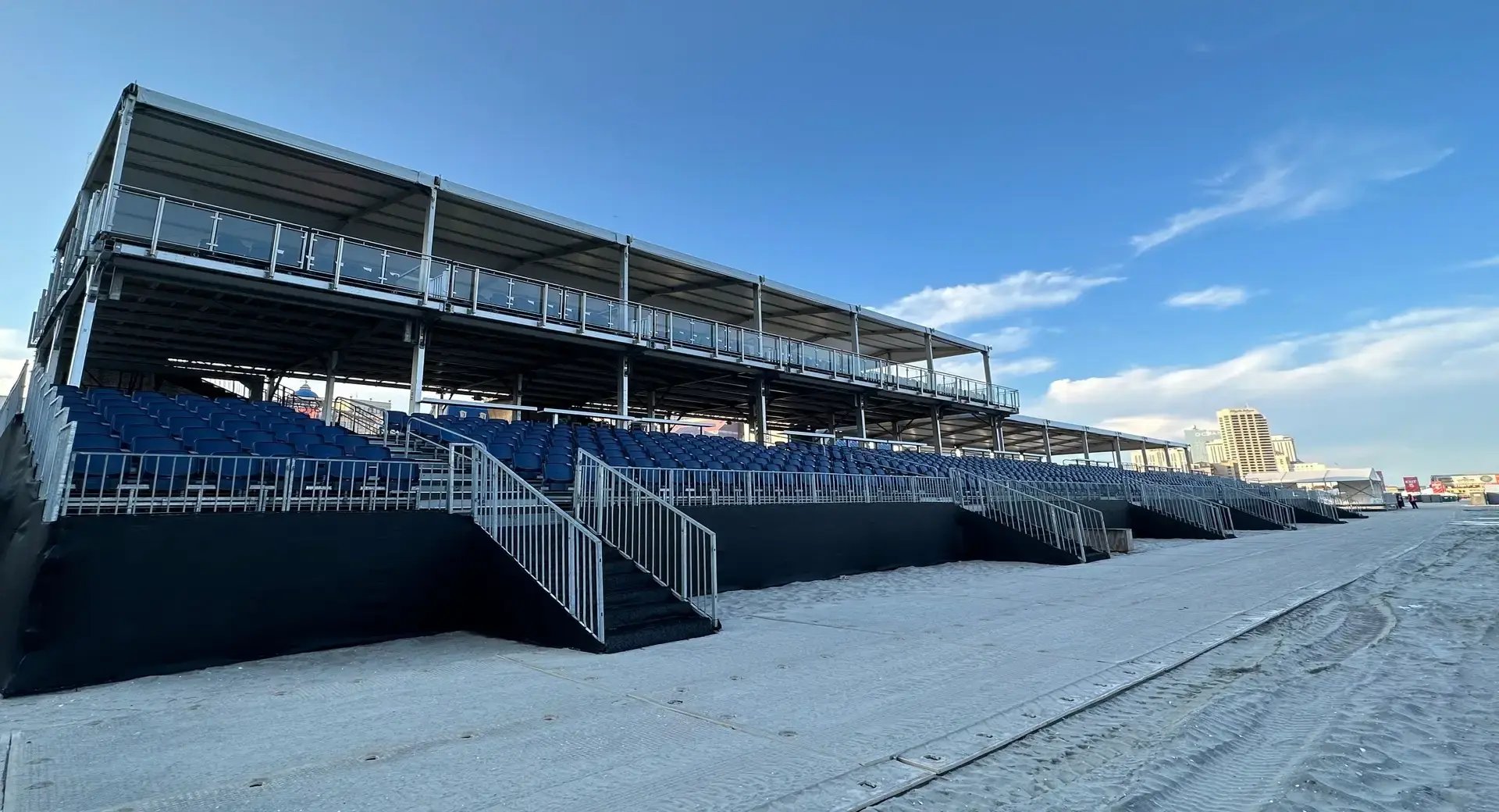 InProduction tiered seating installed on the sand at the Beach It! Festival, providing clear sightlines and a premium viewing experience toward the main stage.