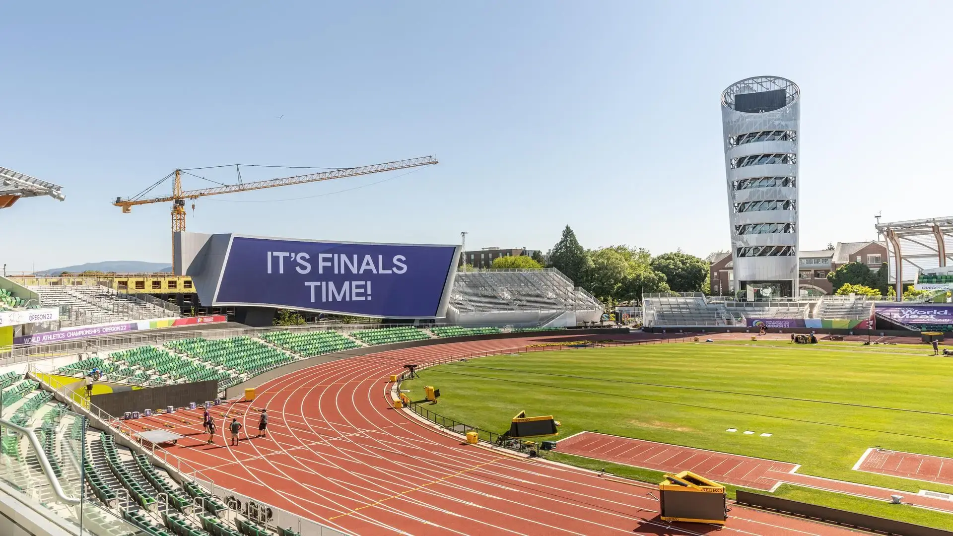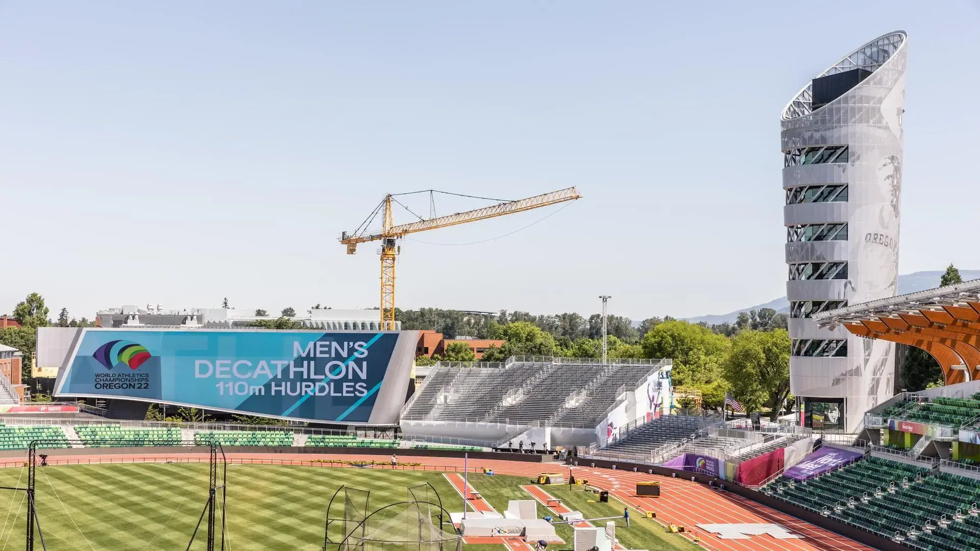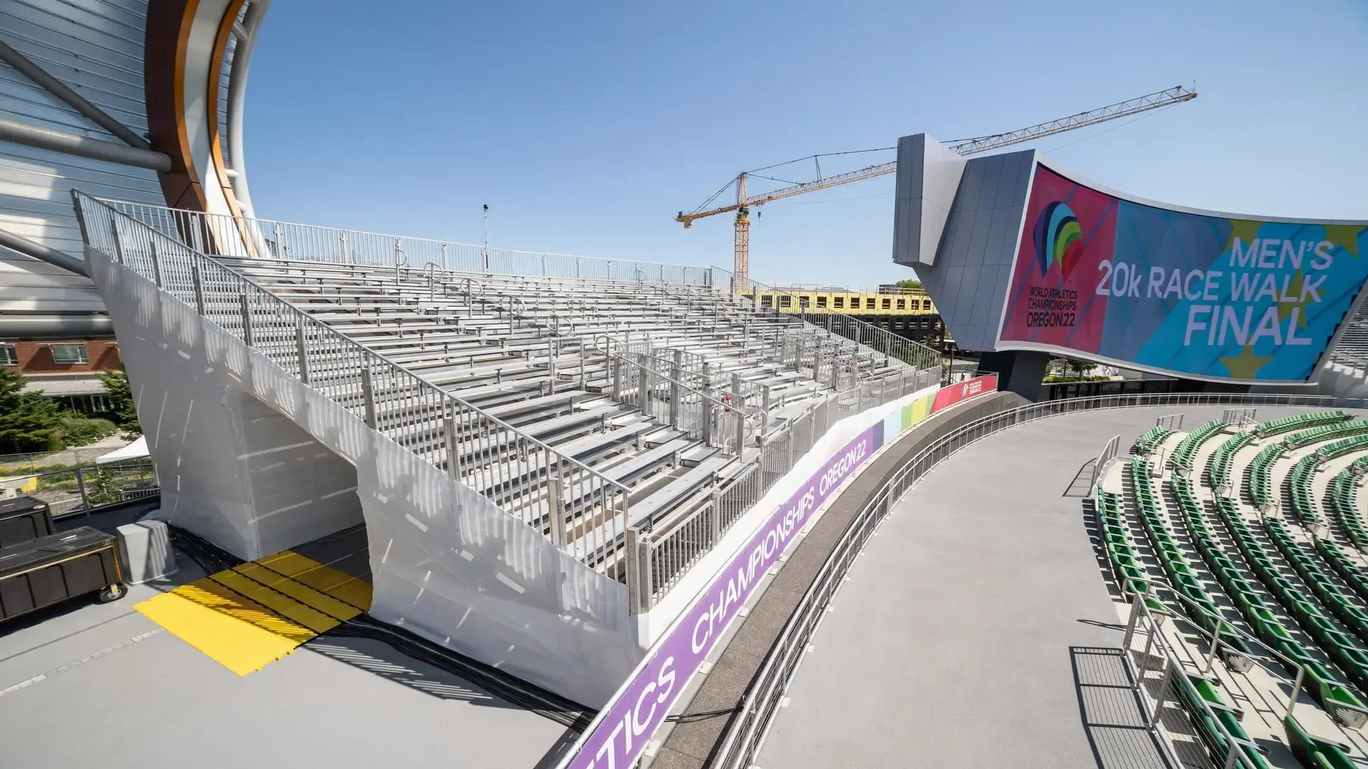 InProduction temporary on-field seating installed at the World Athletics Championships at Hayward Field, providing spectators with closer sightlines and elevated views of the competition.
