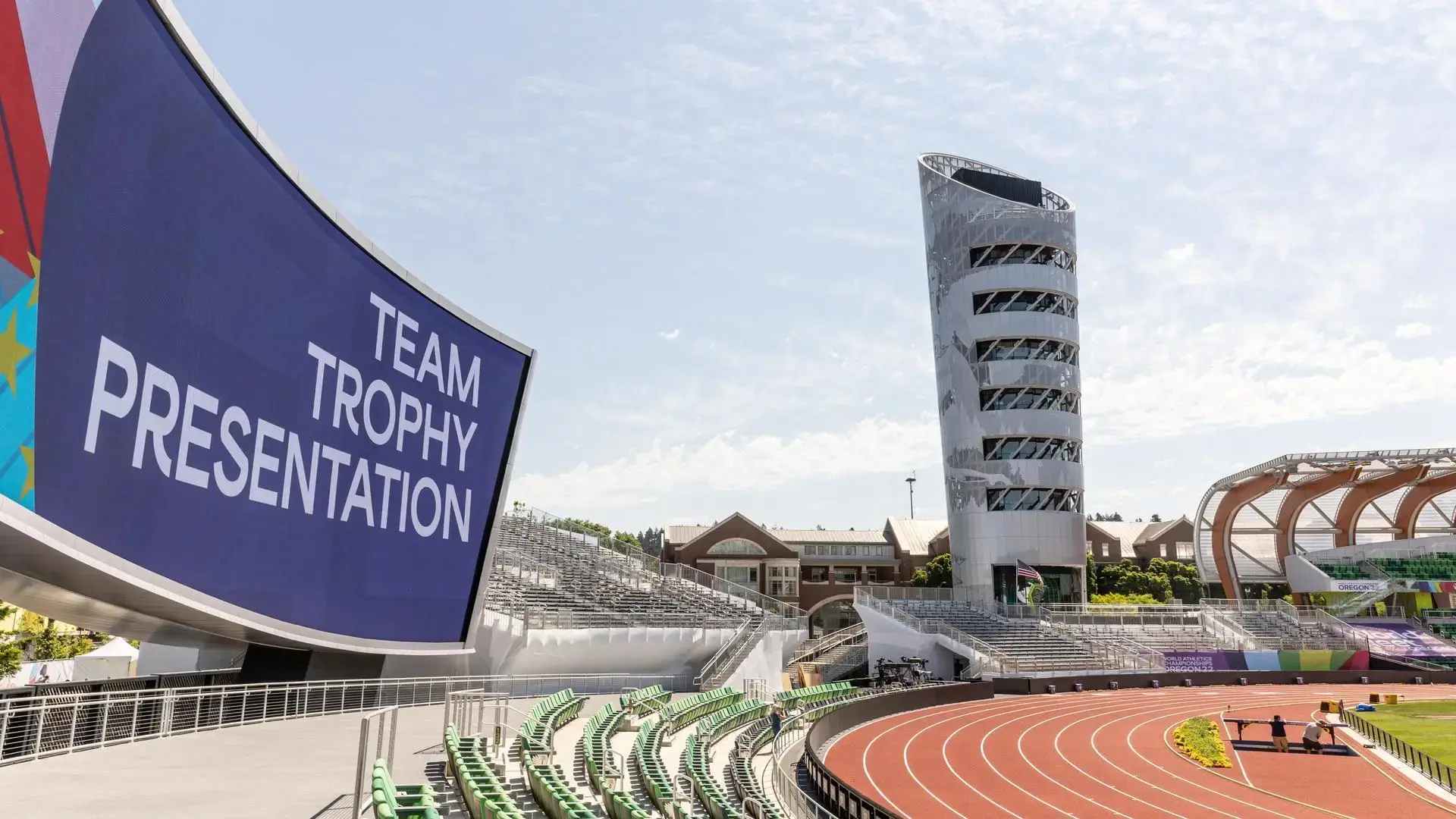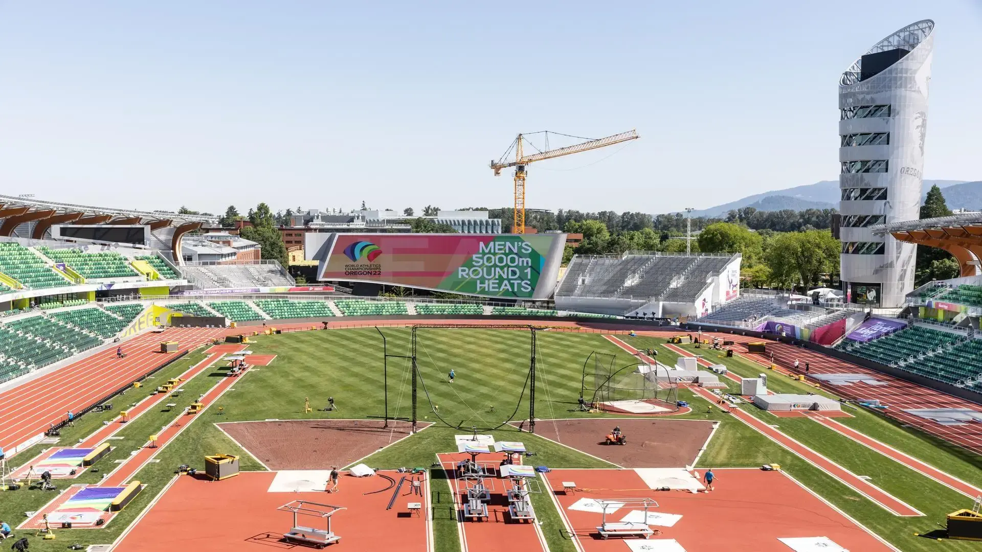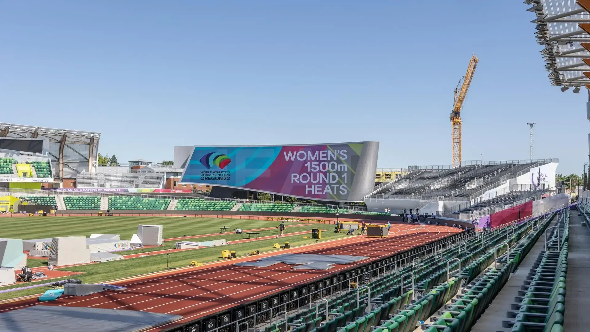 InProduction temporary on-field seating installed at the World Athletics Championships at Hayward Field, providing spectators with closer sightlines and elevated views of the competition.